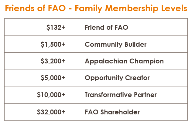 We all have a gift that matters to the future of Appalachian Ohio, and financial gifts have far greater impact when combined. The Friends of FAO Fund enables you to have collective and immediate impact for the people and communities of Appalachian Ohio.